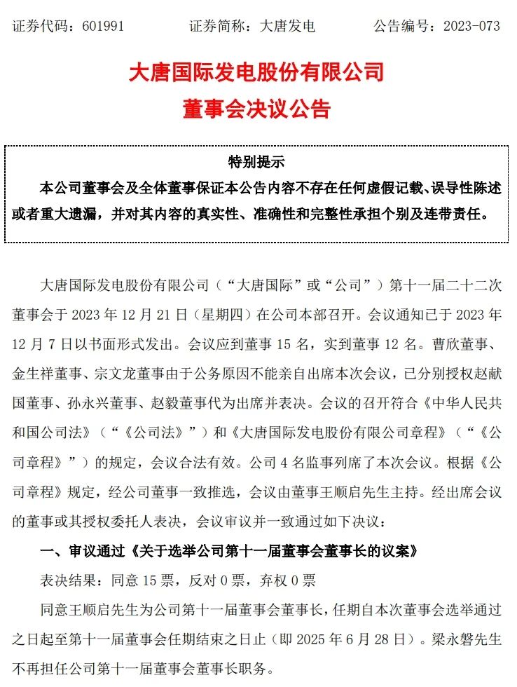 12月21日,大唐國際發(fā)布公告,大唐國際發(fā)電股份有限公司第十一屆二十二次董事會于12月21日召開,審議通過《關(guān)于選舉公司第十一屆董事會董事長的議案》,同意王順啟為公司第十一屆董事會董事長。梁永磐不再擔(dān)任公司第十一屆董事會董事長職務(wù)。