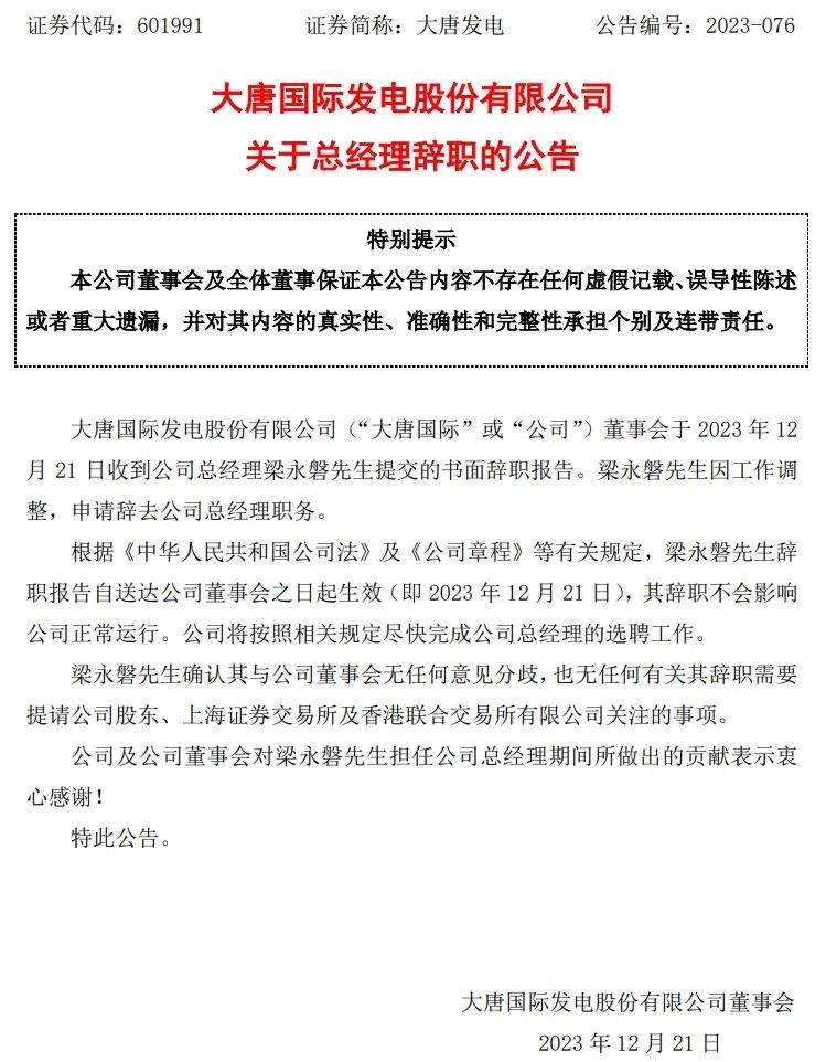 同日,大唐國際發(fā)布總經(jīng)理辭職公告,公司董事會收到總經(jīng)理梁永磐先生提交的書面辭職報(bào)告。梁永磐先生因工作調(diào)整,申請辭去公司總經(jīng)理職務(wù)。