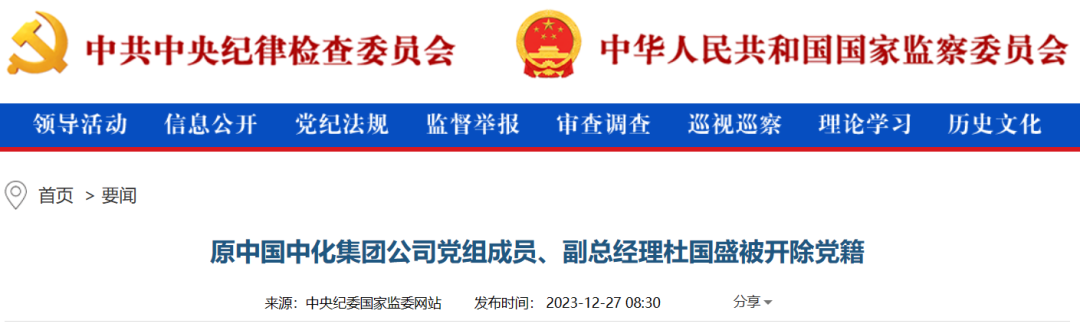 中央紀(jì)委國家監(jiān)委網(wǎng)站12月27日消息,據(jù)中國中化控股有限責(zé)任公司紀(jì)檢監(jiān)察組、福建省紀(jì)委監(jiān)委消息:日前,中國中化控股有限責(zé)任公司紀(jì)檢監(jiān)察組、福建省泉州市監(jiān)委對原中國中化集團(tuán)公司黨組成員、副總經(jīng)理杜國盛嚴(yán)重違紀(jì)違法問題進(jìn)行了紀(jì)律審查和監(jiān)察調(diào)查。