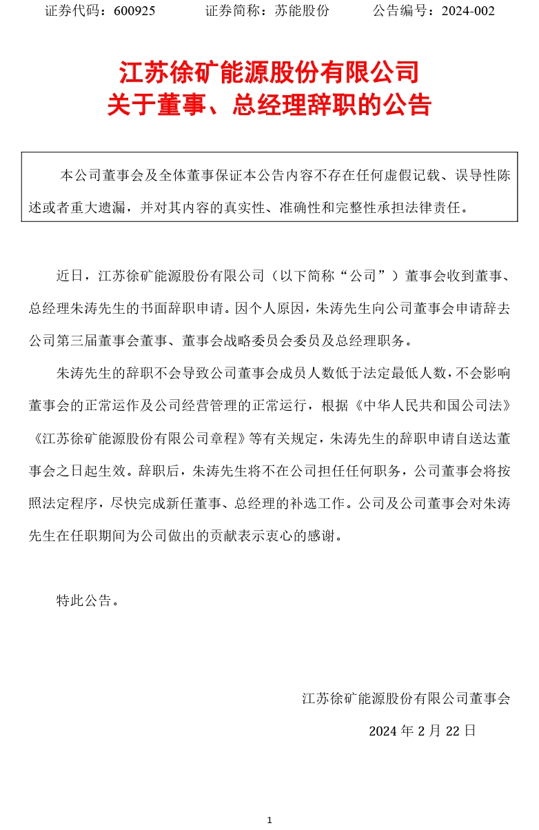 2月22日,蘇能股份發(fā)布公告,近日,董事會收到董事、總經(jīng)理朱濤先生的書面辭職申請。因個人原因,朱濤先生向公司董事會申請辭去公司第三屆董事會董事、董事會戰(zhàn)略委員會委員及總經(jīng)理職務。