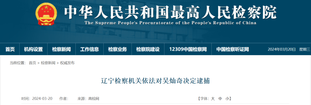 經(jīng)遼寧省人民檢察院指定管轄,由朝陽市人民檢察院審查起訴。日前,朝陽市人民檢察院依法以涉嫌受賄罪對吳燦奇作出逮捕決定。該案正在進(jìn)一步辦理中。