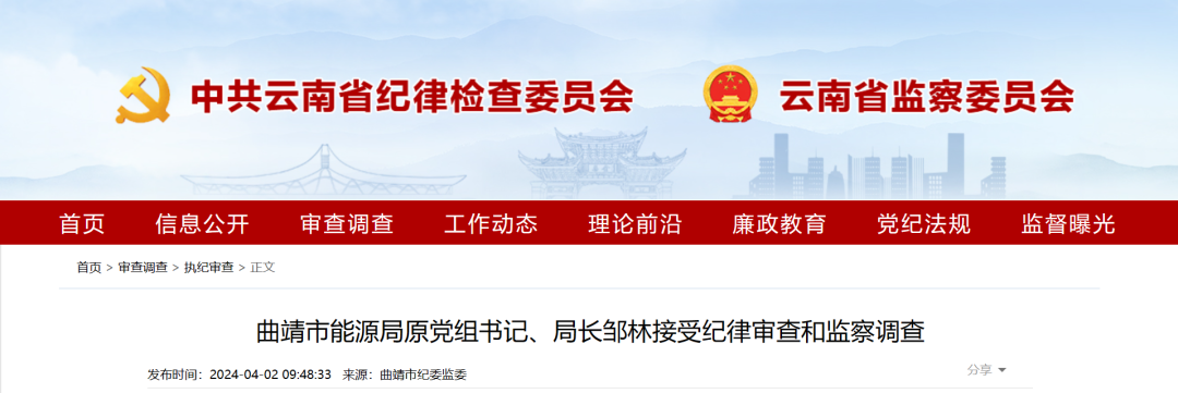 據(jù)曲靖市紀(jì)委監(jiān)委消息:曲靖市能源局原黨組書記、局長鄒林涉嫌嚴(yán)重違紀(jì)違法,主動(dòng)投案,目前正接受曲靖市紀(jì)委監(jiān)委紀(jì)律審查和監(jiān)察調(diào)查。