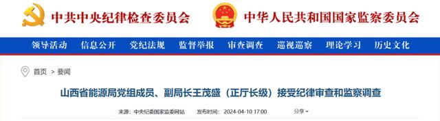 中央紀(jì)委國(guó)家監(jiān)委網(wǎng)站4月10日,據(jù)山西省紀(jì)委監(jiān)委消息:山西省能源局黨組成員、副局長(zhǎng)王茂盛(正廳長(zhǎng)級(jí))涉嫌嚴(yán)重違紀(jì)違法,目前正接受山西省紀(jì)委監(jiān)委紀(jì)律審查和監(jiān)察調(diào)查。