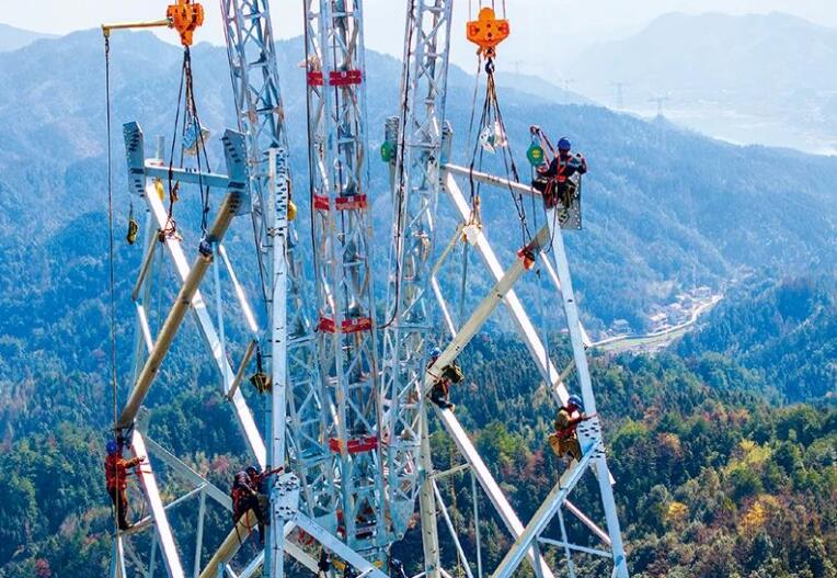 圖為2024年3月12日,電力工人在湖南省益陽市安化縣冷市鎮(zhèn)進(jìn)行組塔作業(yè)。 新華社記者 陳思汗/攝