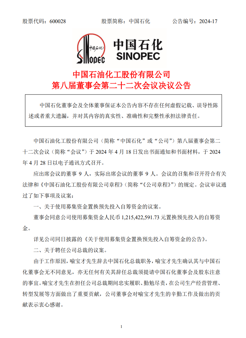 4月29日,中國(guó)石化發(fā)布公告稱,由于工作原因,喻寶才先生辭去中國(guó)石化總裁職務(wù)。董事會(huì)聘任趙東先生為中國(guó)石化總裁,同時(shí)調(diào)整為執(zhí)行董事,聘期自董事會(huì)批準(zhǔn)之日起至第八屆董事會(huì)任期屆滿時(shí)止。