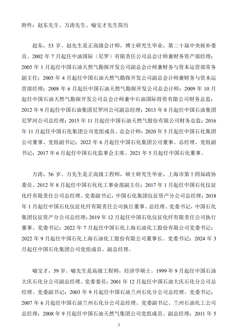 此外,按照《公司章程》的規(guī)定,根據(jù)總裁提名,董事會(huì)聘任萬(wàn)濤先生、喻寶才先生為中國(guó)石化高級(jí)副總裁,聘期自董事會(huì)批準(zhǔn)之日起至第八屆董事會(huì)任期屆滿時(shí)止。