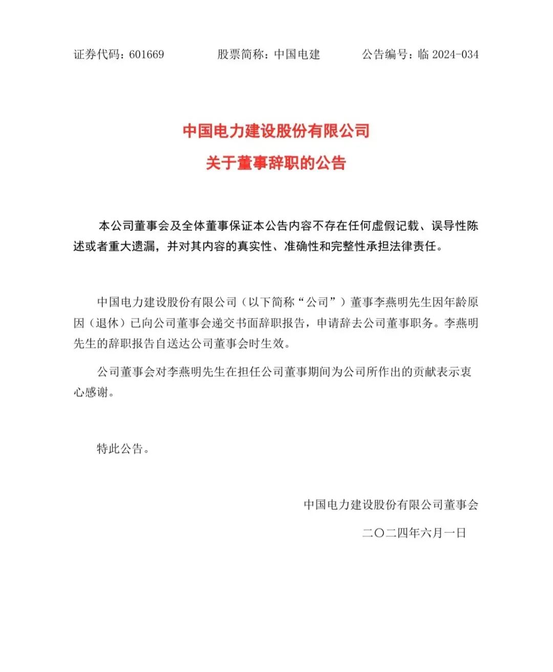 6月1日,中國電建發(fā)布公告稱,公司董事李燕明先生因年齡原因(退休)已向公司董事會遞交書面辭職報(bào)告,申請辭去公司董事職務(wù)。李燕明先生的辭職報(bào)告自送達(dá)公司董事會時(shí)生效。