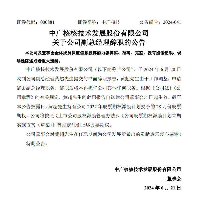 6月21日,中廣核技發(fā)布公告稱,公司于6月20日收到公司副總經(jīng)理黃超先生提交的書面辭職報告,黃超先生由于工作調(diào)整,申請辭去副總經(jīng)理職務(wù),辭職后將不再擔(dān)任公司其他任何職務(wù)。