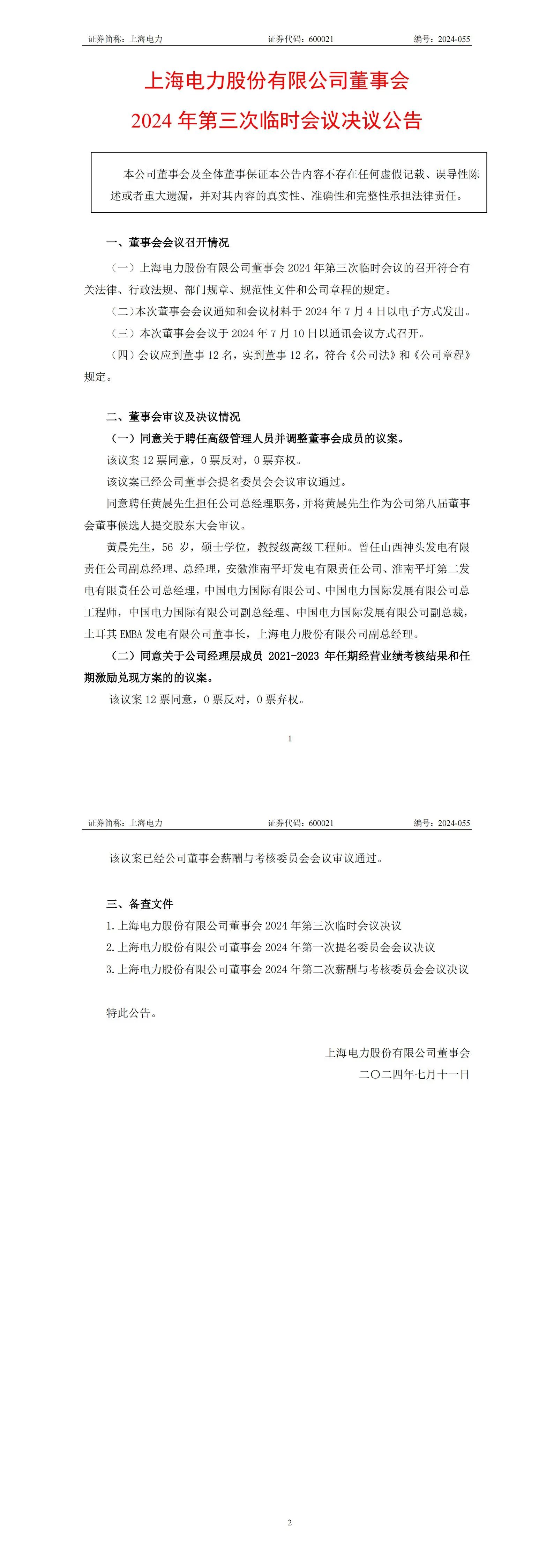 7月11日,上海電力公告,董事會同意關于聘任高級管理人員并調(diào)整董事會成員的議案,同意聘任黃晨先生擔任公司總經(jīng)理職務,并將黃晨先生作為公司第八屆董事會董事候選人提交股東大會審議。
