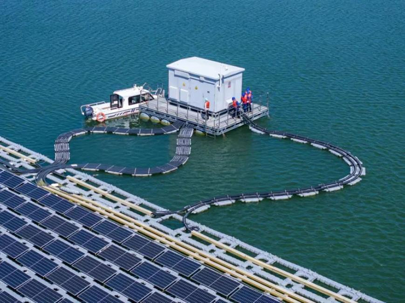 國(guó)網(wǎng)山東電力員工在世界單體最大水上漂浮式光伏電站協(xié)助用戶開展設(shè)備運(yùn)行維護(hù)。