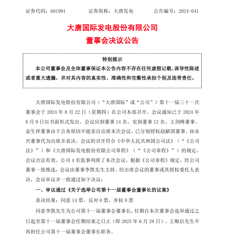 8月23日,大唐發(fā)電公告稱(chēng),董事會(huì)審議通過(guò)《關(guān)于選舉公司第十一屆董事會(huì)董事長(zhǎng)的議案》,同意李凱先生為公司第十一屆董事會(huì)董事長(zhǎng),任期自本次董事會(huì)選舉通過(guò)之 日起至第十一屆董事會(huì)任期結(jié)束之日止(即2025年6月28日)。王順啟先生不再擔(dān)任公司第十一屆董事會(huì)董事長(zhǎng)職務(wù)。