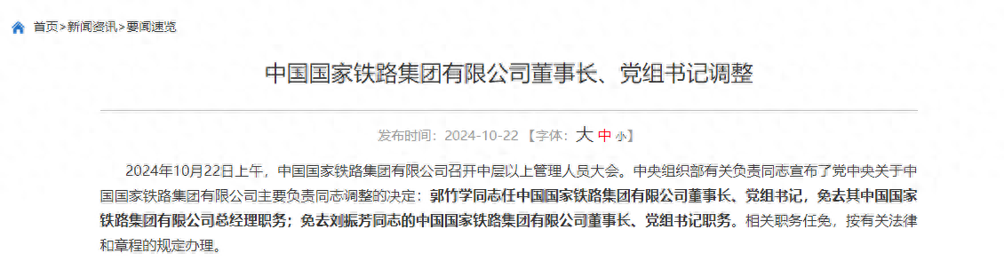 中央組織部有關(guān)負(fù)責(zé)同志宣布了黨中央關(guān)于中國國家鐵路集團有限公司主要負(fù)責(zé)同志調(diào)整的決定:郭竹學(xué)同志任中國國家鐵路集團有限公司董事長、黨組書記,免去其中國國家鐵路集團有限公司總經(jīng)理職務(wù);免去劉振芳同志的中國國家鐵路集團有限公司董事長、黨組書記職務(wù)。