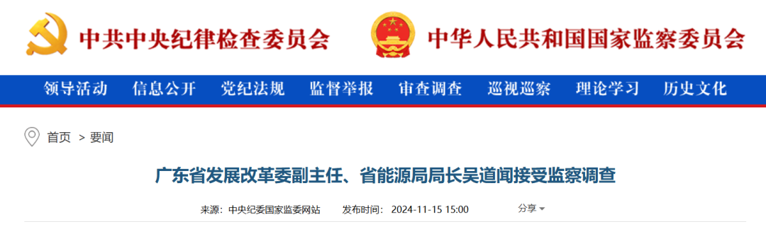 中央紀(jì)委國家監(jiān)委網(wǎng)站11月15日消息, 據(jù)廣東省紀(jì)委監(jiān)委消息:廣東省發(fā)展改革委副主任、省能源局局長(zhǎng)吳道聞涉嫌嚴(yán)重違法,目前正接受廣東省監(jiān)委監(jiān)察調(diào)查。