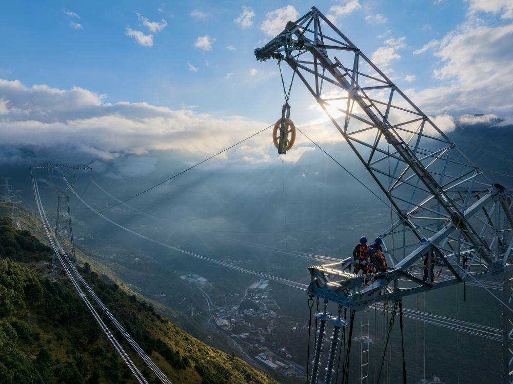 2024年10月15日,施工人員在國(guó)家電網(wǎng)川渝1000千伏特高壓交流工程進(jìn)行收緊導(dǎo)線作業(yè)