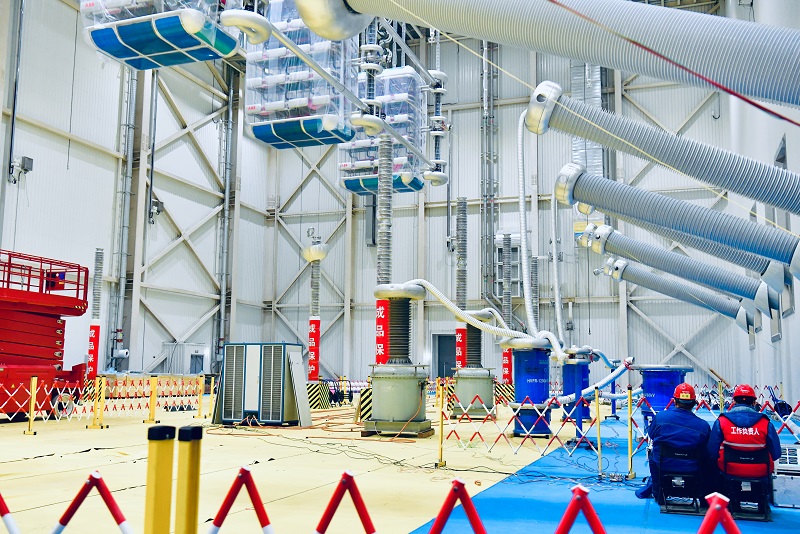 國(guó)網(wǎng)山東電力員工在±800千伏東平換流站開展換流變壓器試驗(yàn)工作