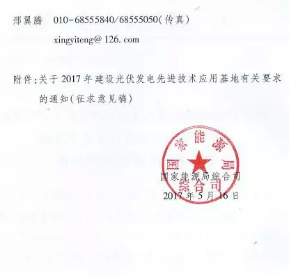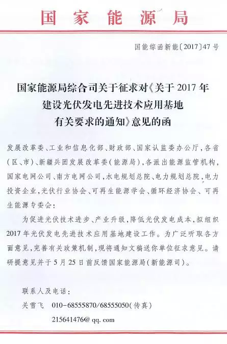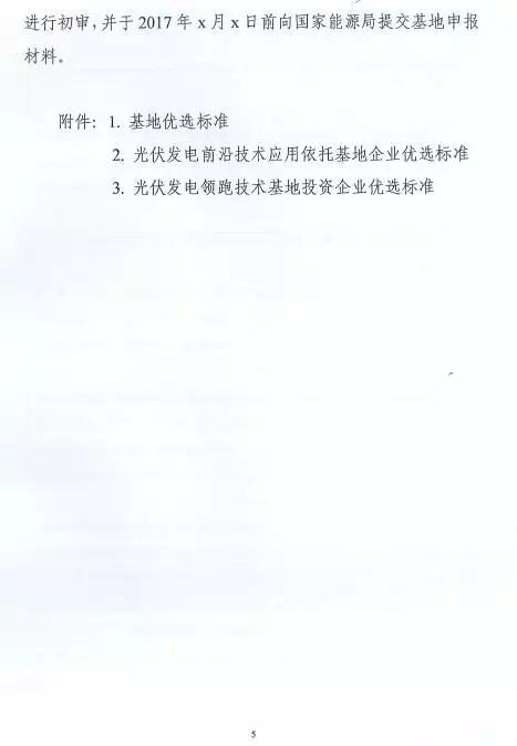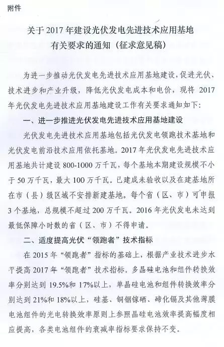 以下為《關(guān)于2017年建設(shè)光伏發(fā)電先進(jìn)技術(shù)應(yīng)用基地有關(guān)要求的通知》(征求意見稿)