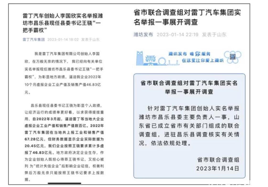 1月14日小年夜,一篇題為《雷丁汽車創(chuàng)始人李國(guó)欣實(shí)名舉報(bào)濰坊市昌樂縣現(xiàn)任縣委書記王驍“一把手霸權(quán)”》的文章在各大社交平臺(tái)“刷屏”,該篇文章由“雷丁汽車集團(tuán)”微信公眾號(hào)發(fā)布。同時(shí),雷丁汽車創(chuàng)始人李國(guó)欣在雷丁汽車視頻號(hào)發(fā)布了一則時(shí)長(zhǎng)約一分鐘的視頻,稱“昌樂縣現(xiàn)任縣委書記王驍逼迫公司提報(bào)虛假統(tǒng)計(jì)數(shù)據(jù)近50億元”。