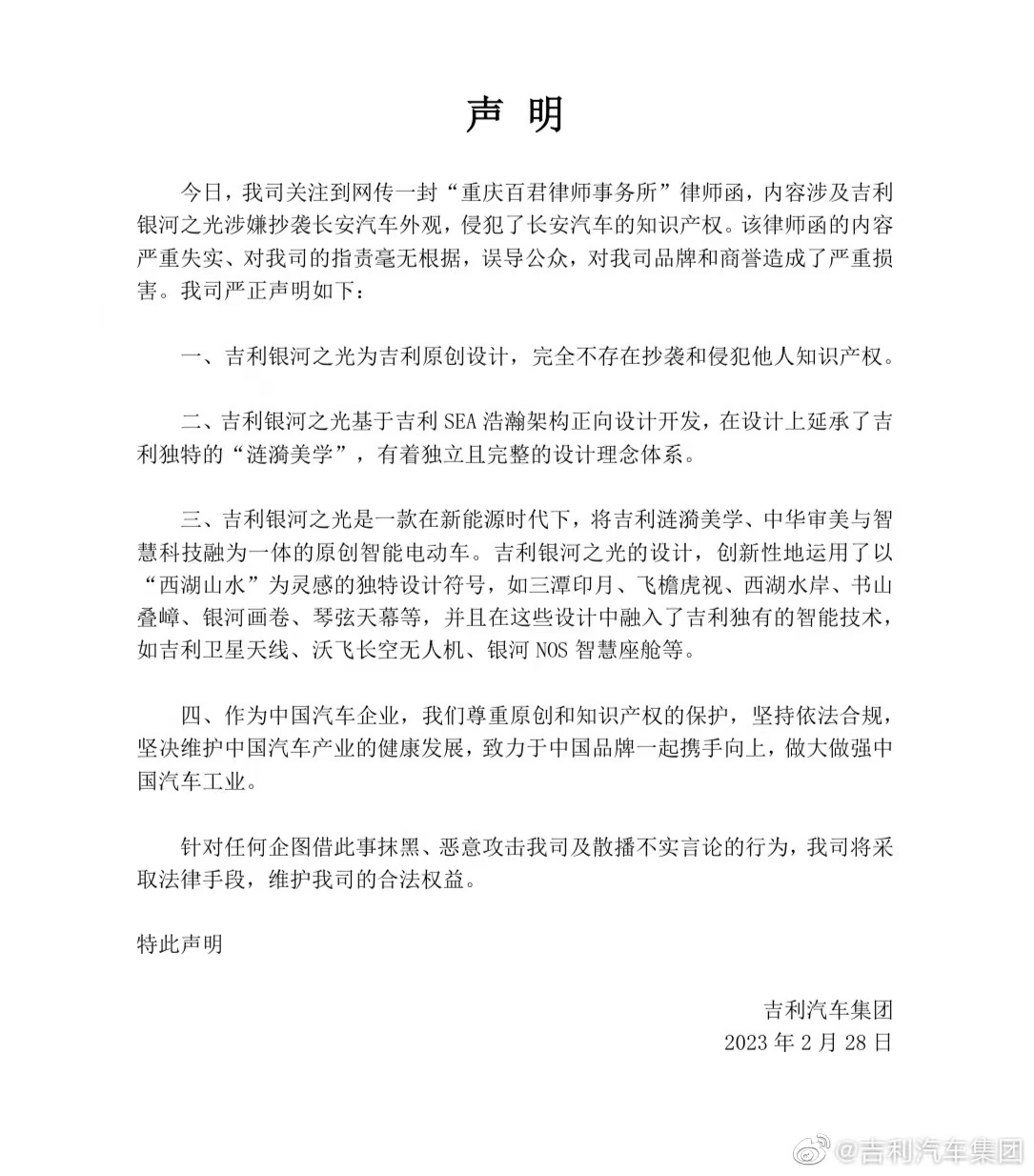 這封律師函曝光幾個(gè)小時(shí)之后,吉利汽車(chē)集團(tuán)就在官方微博發(fā)表了一份聲明。