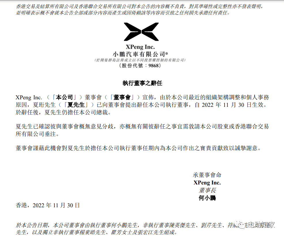 不久前,夏珩更是接連卸任廣東小鵬汽車科技有限公司、廣州小鵬汽車科技有限公司職務(wù),并均由何小鵬接任。2022年11月30日,小鵬汽車發(fā)布公告稱,因公司組織架構(gòu)調(diào)整及個人事務(wù)原因,小鵬汽車聯(lián)合創(chuàng)始人、總裁夏珩將辭去公司董事會執(zhí)行董事職務(wù),11月30日生效。辭任執(zhí)行董事后,夏珩仍將擔(dān)任小鵬汽車總裁一職。