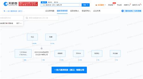股權全景穿透圖顯示,該公司由1.8Meters Technology Holding Limited、杭州大井頭貳拾貳號文化藝術有限公司以及胡曉明等4名自然人共同持股。其中,杭州大井頭貳拾貳號文化藝術有限公司由馬云持股99.9%;持有一米八海洋科技5.5%股權并擔任董事長的胡曉明則曾任螞蟻集團CEO。