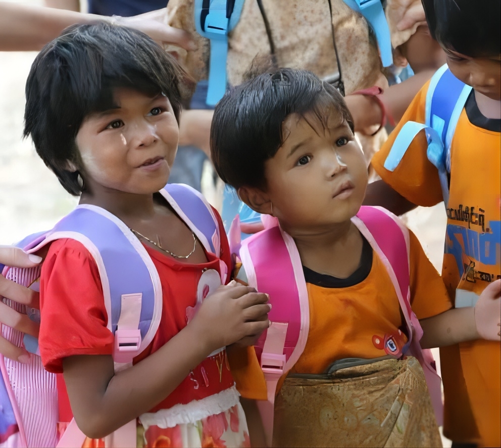 幾個(gè)小孩子面對(duì)志愿者們陌生的面孔,表現(xiàn)得非常興奮,做出喜悅和歡迎的手勢(shì)迎接志愿者。當(dāng)為他們背上書包、送上糖果時(shí),孩子們?cè)诜块g里歡呼雀躍。孩子們天真爛漫、滿足幸福的神情也深深感染了志愿者。