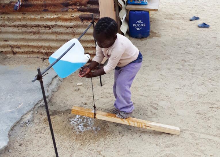 圖為中核集團(tuán)控股的羅辛鈾礦為當(dāng)?shù)刂谱骱?jiǎn)易洗手消毒裝置。(中核集團(tuán)供圖)
