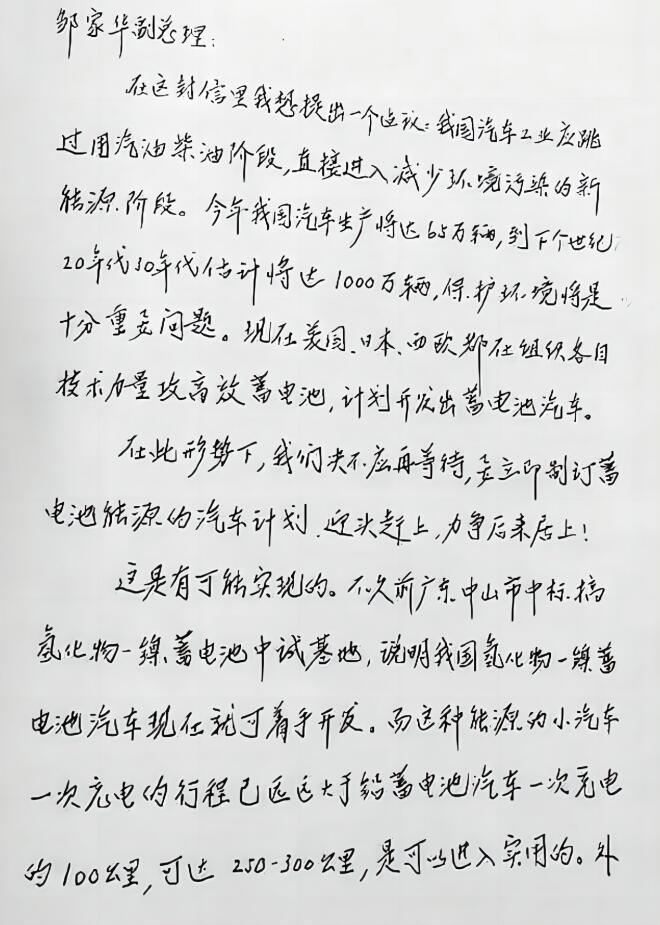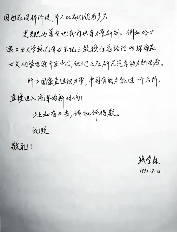 1992年,當(dāng)時(shí)已81歲高齡的錢學(xué)森寫信給時(shí)任副總理鄒家華,提出了一個(gè)高瞻遠(yuǎn)矚的建議:“我國(guó)汽車工業(yè)應(yīng)跳過(guò)用汽油柴油階段,直接進(jìn)入減少環(huán)境污染的新能源階段……到下個(gè)世紀(jì)20年代保護(hù)環(huán)境將是十分重要問(wèn)題?,F(xiàn)在美國(guó)、日本、西歐都在組織各自技術(shù)力量攻高效蓄電池,計(jì)劃開(kāi)發(fā)出蓄電池汽車。”