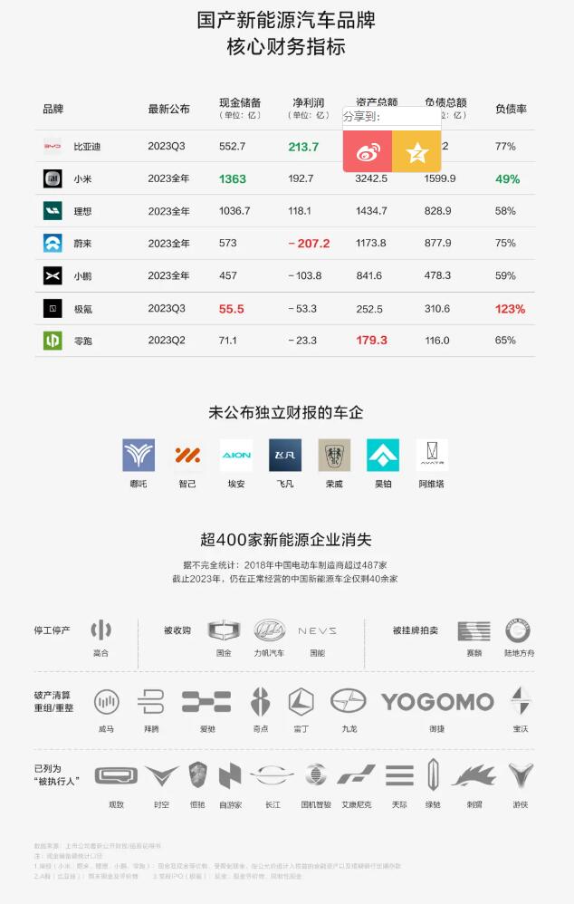 就是過去五年來,內(nèi)卷加速“品牌淘汰”,大批造車企業(yè)消亡。據(jù)不完全統(tǒng)計僅在2018年-2023年五年間,銷聲匿跡的國產(chǎn)新能源品牌就超過400家,新能源這場大逃殺的淘汰了高達(dá)90%。而細(xì)細(xì)分析,這400多家品牌或多或少有著一些共性:小品牌、高負(fù)債、靠資本輸血、資金實(shí)力差。