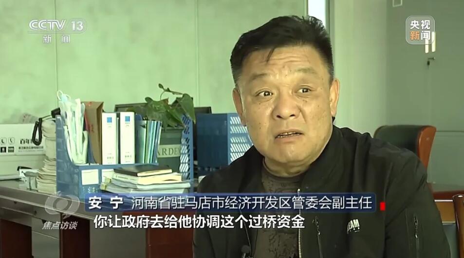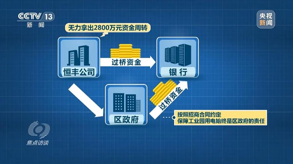 河南省駐馬店市經(jīng)濟(jì)開發(fā)區(qū)管委會副主任安寧:過橋資金2800萬,他自己拿不起,讓政府協(xié)調(diào)過橋資金,政府又為了免于擔(dān)風(fēng)險(xiǎn),幾經(jīng)努力,最后這個事沒有做成。說是為了免擔(dān)風(fēng)險(xiǎn),區(qū)政府沒有幫助協(xié)調(diào)下過橋資金,但是,也沒有履行確保恒豐公司用電負(fù)荷的約定。當(dāng)?shù)亟o產(chǎn)業(yè)園提供的一直是建設(shè)廠房時的臨時用電,220千伏變電站沒有如期建成,對企業(yè)造成的影響,當(dāng)?shù)卣质侨绾慰创哪?河南省駐馬店市經(jīng)濟(jì)開發(fā)區(qū)管委會副主任安寧:電力接上了,是臨時用電,建設(shè)期都給接了。記者:電力保障在前,還是應(yīng)該生產(chǎn)在前?河南省駐馬店市經(jīng)濟(jì)開發(fā)區(qū)管委會副主任安寧:電力保障在前。記者:正式用電的電力保障一直沒有進(jìn)行的原因是什么呢?河南省駐馬店市經(jīng)濟(jì)開發(fā)區(qū)管委會副主任安寧:這個你要問當(dāng)事人。