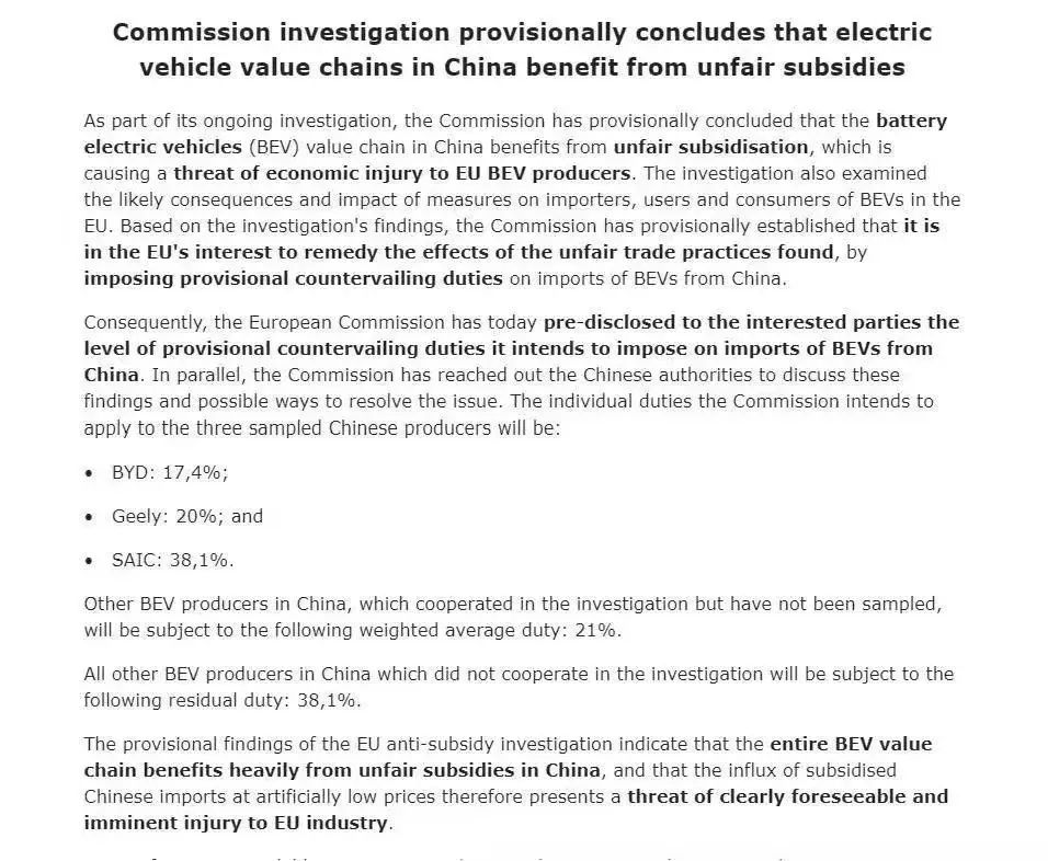 6月12日,歐盟委員會發(fā)布公告稱,如無法與中方達成解決方案,針對從中國進口的電動汽車征收臨時反補貼稅的方案將于7月4日起實施。歐盟委員會表示,對抽樣的三家企業(yè)——比亞迪、吉利汽車和上汽集團,將分別加征17.4%、20%和38.1%的反補貼稅;對參與調(diào)查但未被抽樣的電動汽車制造商平均加征21%的反補貼稅;未配合調(diào)查的電動汽車制造商將被加征38.1%的反補貼稅。