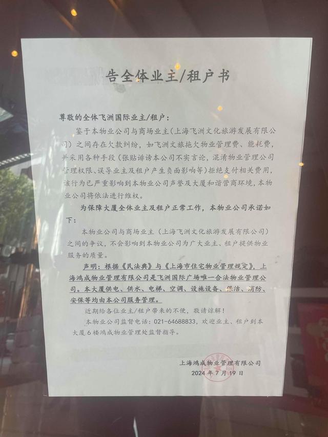 值得注意的是,鴻成物業(yè)與飛洲文旅此前已經(jīng)存在經(jīng)濟糾紛。記者辦公樓下看到,鴻成物業(yè)7月19日發(fā)布了一份“告全體業(yè)主/租戶書”,上面寫著,鴻成物業(yè)與飛洲文旅之間存在欠款糾紛,如飛洲文旅拖欠物業(yè)費、能耗費,并拒絕支付相關費用,鴻成物業(yè)將進行依法維權(quán)。