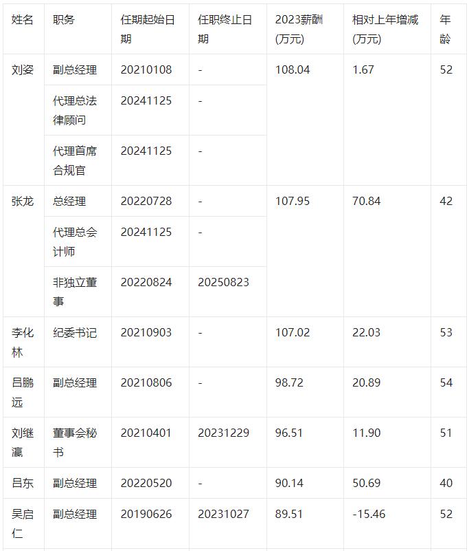 根據(jù)2023年報(bào)數(shù)據(jù),剔除獨(dú)立董事、監(jiān)事會(huì)主席、監(jiān)事后,三峽能源共有13位董事和高級(jí)管理人員。從年齡看,三峽能源董事和高級(jí)管理人員平均年齡為50.23歲,年齡中位數(shù)為52歲,其中,非獨(dú)立董事蔡庸忠年齡最高為62歲,副總經(jīng)理呂東年齡最小為40歲。從薪酬看,董事和高級(jí)管理人員合計(jì)領(lǐng)取報(bào)酬904.35萬(wàn)元,平均薪酬86.18萬(wàn)元,年薪中位數(shù)為98.72萬(wàn)元。其中,副總經(jīng)理、代理總法律顧問(wèn)及代理首席合規(guī)官劉姿薪酬最高為108.04萬(wàn)元,非獨(dú)立董事蔡庸忠薪酬最低為6.00萬(wàn)元(2023年任期不滿1年的不參與統(tǒng)計(jì))。