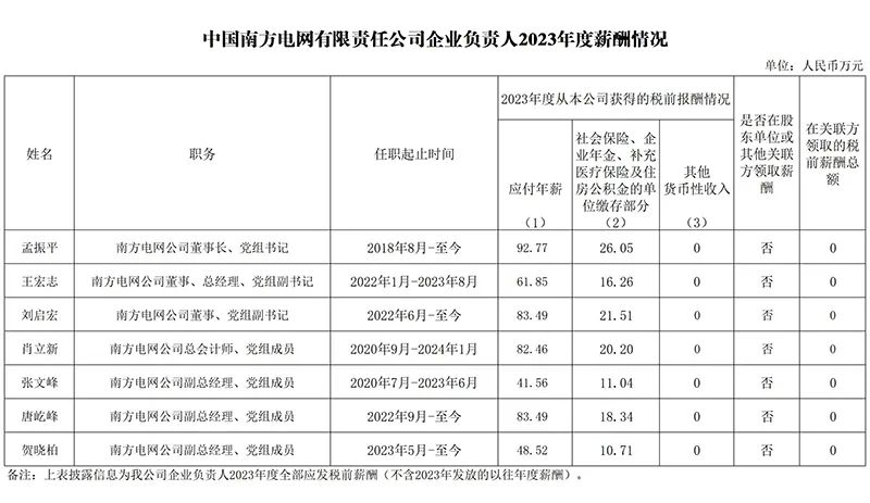 中國(guó)南方電網(wǎng)有限責(zé)任公司企業(yè)負(fù)責(zé)人2023年度薪酬情況的表格詳細(xì)列出了幾位高層管理人員的姓名、職務(wù)、任職起止時(shí)間以及他們的薪酬構(gòu)成。