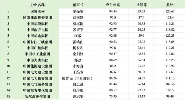 整體看,電力央企董事長稅前年薪總額在98萬元到123萬元,取平均值,15家電力央企董事長平均稅前年薪總額約115.13萬元。