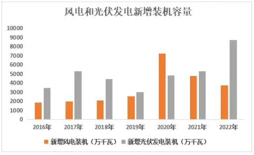 2022年光伏發(fā)電的新增容量為8741萬(wàn)千瓦,較2021年大幅增長(zhǎng)了65%;風(fēng)電的新增裝機(jī)為3763萬(wàn)千瓦,同比反而下降了21%。風(fēng)電的發(fā)展起步較早,此前總裝機(jī)容量一直高于光伏。但近年來(lái)由于光伏裝機(jī)量的迅速攀升,而風(fēng)電進(jìn)入平價(jià)上網(wǎng)后裝機(jī)步伐放緩,2022年光伏發(fā)電的累計(jì)裝機(jī)規(guī)模首次超過(guò)風(fēng)電。