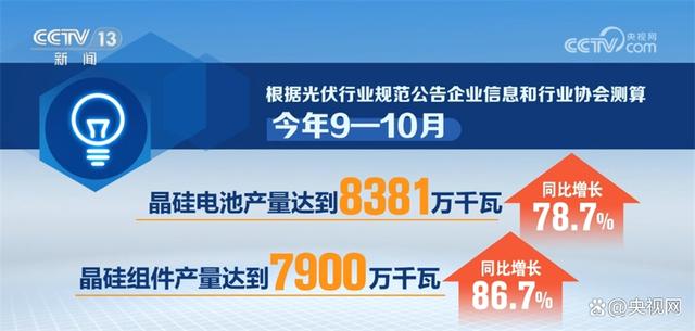 根據(jù)光伏行業(yè)規(guī)范公告企業(yè)信息和行業(yè)協(xié)會(huì)測(cè)算,今年9—10月,全國(guó)多晶硅產(chǎn)量達(dá)到23.66萬(wàn)噸,同比增長(zhǎng)90%;硅片產(chǎn)量8795萬(wàn)千瓦,同比增長(zhǎng)61%;晶硅電池、晶硅組件產(chǎn)量分別達(dá)到8381萬(wàn)千瓦、7900萬(wàn)千瓦,同比分別增長(zhǎng)78.7%、86.7%。