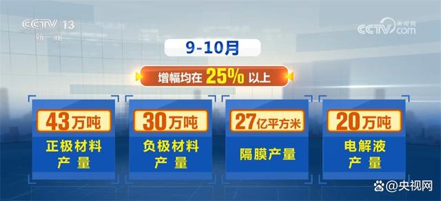 據(jù)了解,今年以來(lái),我國(guó)鋰電池生產(chǎn)各環(huán)節(jié)均保持高位增長(zhǎng)。9—10月,正極材料、負(fù)極材料、隔膜、電解液產(chǎn)量分別達(dá)到43萬(wàn)噸、30萬(wàn)噸、27億平方米、20萬(wàn)噸,增幅均在25%以上。