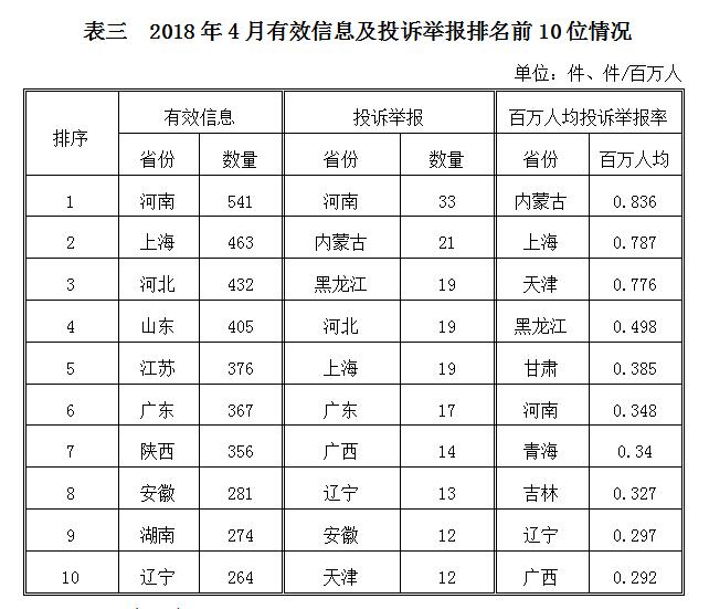 2018年4月,各?。ㄗ灾螀^(qū)、直轄市)按照有效信息數(shù)量排序,河南、上海、河北等?。ㄊ校┝腥珖?guó)前10位;按照投訴舉報(bào)數(shù)量排序,河南、內(nèi)蒙古、黑龍江等?。ㄗ灾螀^(qū))排在全國(guó)前10位;按照百萬(wàn)人均投訴舉報(bào)率排序,內(nèi)蒙古、上海、天津等省(市、自治區(qū))位于全國(guó)前10位。(2018年4月有效信息及投訴舉報(bào)排名前10位情況見(jiàn)表三)