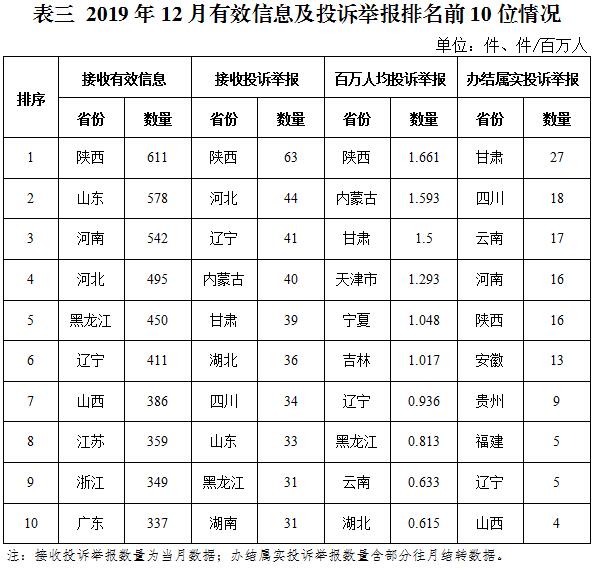 各省(自治區(qū)、直轄市)按照收到的有效信息數(shù)量排序,陜西、山東、河南、河北、黑龍江等列全國(guó)前10位;按照投訴舉報(bào)數(shù)量排序,陜西、河北、遼寧、內(nèi)蒙古、甘肅等排在全國(guó)前10位;按照百萬人均投訴舉報(bào)數(shù)量排序,陜西,內(nèi)蒙古,甘肅,天津市,寧夏等排在全國(guó)前10位;按照辦結(jié)屬實(shí)投訴舉報(bào)數(shù)量排序,甘肅、四川、云南、河南、陜西等排在全國(guó)前10位。(2019年12月有效信息及投訴舉報(bào)排名前10位情況見表三)