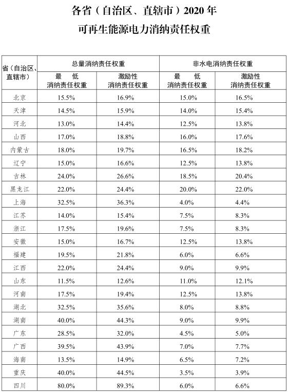 根據(jù)《國(guó)家發(fā)展改革委 國(guó)家能源局關(guān)于建立健全可再生能源電力消納保障機(jī)制的通知》(發(fā)改能源〔2019〕807號(hào)),在各地測(cè)算的基礎(chǔ)上,我們統(tǒng)籌提出了各省級(jí)行政區(qū)域2020年可再生能源電力消納責(zé)任權(quán)重,現(xiàn)印發(fā)你們,請(qǐng)認(rèn)真組織落實(shí)。