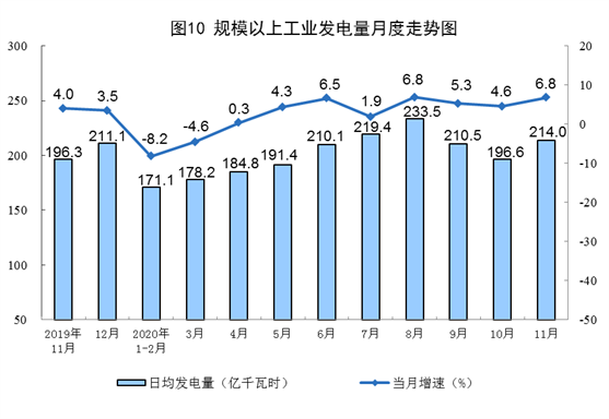 統(tǒng)計(jì)顯示,11月份,全國(guó)規(guī)模以上工業(yè)原煤、原油、天然氣生產(chǎn)保持平穩(wěn)增長(zhǎng),電力生產(chǎn)明顯加快。其中,11月份,發(fā)電量6419億千瓦時(shí),同比增長(zhǎng)6.8%,增速比上月加快2.2個(gè)百分點(diǎn);日均發(fā)電214.0億千瓦時(shí),環(huán)比增加17.4億千瓦時(shí)。1—11月份,發(fā)電量66824億千瓦時(shí),同比增長(zhǎng)2.0%。
