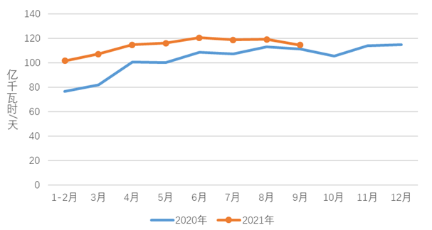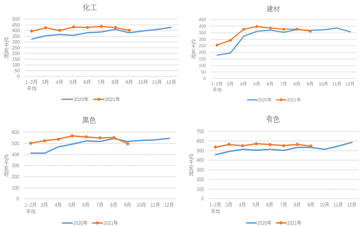 1-9月,化工行業(yè)用電量3740億千瓦時(shí),同比增長(zhǎng)8.9%,增速比上年同期提高9.5個(gè)百分點(diǎn);建材行業(yè)用電量3084億千瓦時(shí),同比增長(zhǎng)12.3%,增速比上年同期提高11.4個(gè)百分點(diǎn);黑色金屬冶煉行業(yè)用電量4800億千瓦時(shí),同比增長(zhǎng)10.6%,增速比上年同期提高8.3個(gè)百分點(diǎn);有色金屬冶煉行業(yè)用電量4996億千瓦時(shí),同比增長(zhǎng)7.3%,增速比上年同期提高3.9個(gè)百分點(diǎn)。