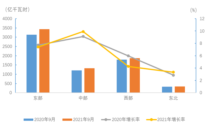 9月份,東、中、西部和東北地區(qū)全社會(huì)用電量增速分別為7.4%、9.9%、4.3%和3.3%。