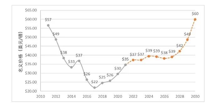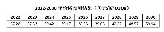 報告還對2022-2030年天然鈾現(xiàn)貨價格作了預(yù)測。之所以選擇對長期現(xiàn)貨價格進行預(yù)測,是因為該價格是反應(yīng)市場供需關(guān)系的主要指標(biāo),是長貿(mào)協(xié)議引用的重要指數(shù),且不易受到短期市場投機行為的影響。