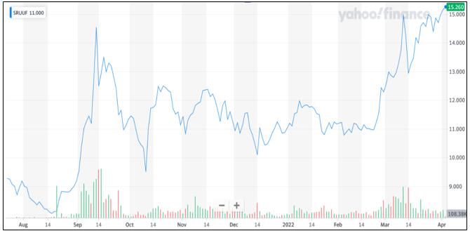 加拿大鈾投資基金斯普羅特(SPUT)股價表現(xiàn)(2021.8-2022.3)