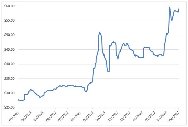 天然鈾現(xiàn)貨價格(2021.3-2022.3)