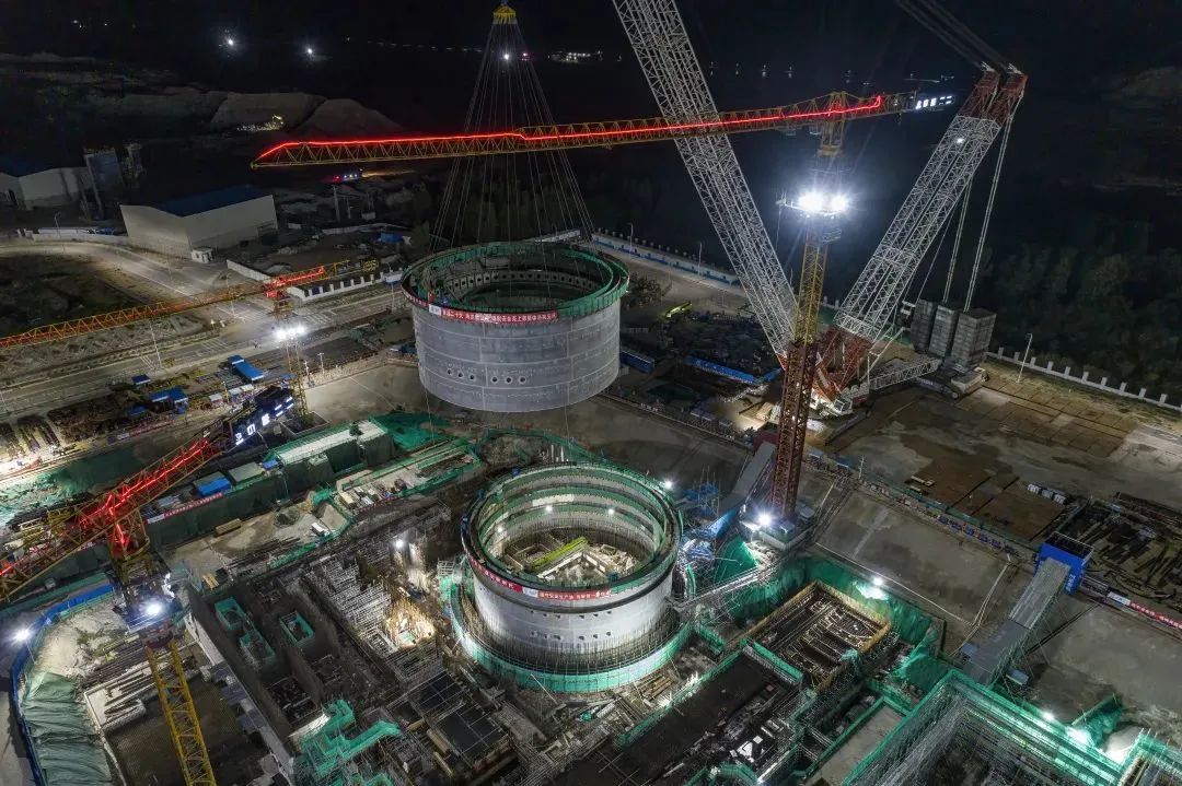 本次吊裝的鋼制安全殼上部筒體整體高度約15米,吊裝重量約720噸,是玲龍一號工程單次重量最大的一次吊裝。鋼制安全殼上部筒體整體由4層共32個瓣片拼裝而成,現(xiàn)場采用了工廠化制造、模塊化施工的先進(jìn)建設(shè)模式,優(yōu)化了現(xiàn)場施工邏輯,有效節(jié)約了現(xiàn)場施工工期,為反應(yīng)堆土建結(jié)構(gòu)與鋼結(jié)構(gòu)協(xié)同推進(jìn)創(chuàng)造了條件。