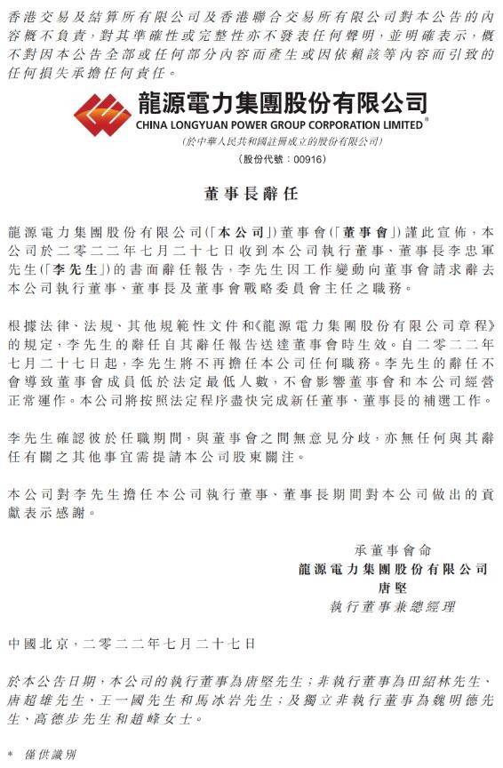 本網(wǎng)訊 根據(jù)公告,龍源電力董事會于2022年7月27日收到公司董事長李忠軍的書面辭任報告,李忠軍因工作變動,向董事會申請辭去公司執(zhí)行董事、董事長以及董事會戰(zhàn)略委員會主任之職務(wù)。李忠軍的辭任自其辭任報告送達(dá)董事會時生效。自2022年7月27日起,李忠軍將不再擔(dān)任公司任何職務(wù)。