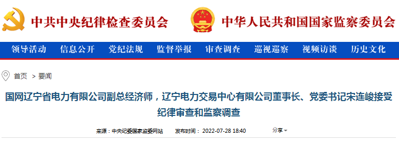 本網(wǎng)訊 中央紀(jì)委國(guó)家監(jiān)委網(wǎng)站7月28日消息,據(jù)中央紀(jì)委國(guó)家監(jiān)委駐國(guó)家電網(wǎng)有限公司紀(jì)檢監(jiān)察組、遼寧省紀(jì)委監(jiān)委消息:國(guó)網(wǎng)遼寧省電力有限公司副總經(jīng)濟(jì)師,遼寧電力交易中心有限公司董事長(zhǎng)、黨委書記宋連峻涉嫌嚴(yán)重違紀(jì)違法,目前正接受中央紀(jì)委國(guó)家監(jiān)委駐國(guó)家電網(wǎng)有限公司紀(jì)檢監(jiān)察組紀(jì)律審查和朝陽(yáng)市監(jiān)察委員會(huì)監(jiān)察調(diào)查。