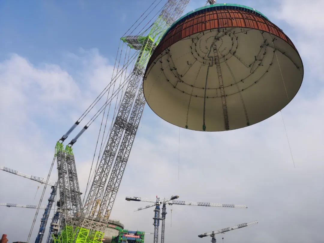 內(nèi)穹頂?shù)跹b是華龍一號核電工程建設(shè)的重要里程碑。穹頂位于核島頂部,主要功能是保證反應(yīng)堆廠房完整性和密封性,對放射性包容起關(guān)鍵性作用。吊裝當(dāng)天,隨著總指揮一聲令下,內(nèi)穹頂被緩緩吊離地面,經(jīng)過起鉤、變幅、提升、帶載行走、大臂逆時針回轉(zhuǎn)等一系列高精度動作,精準(zhǔn)直達漳州核電2號機組反應(yīng)堆廠房上方,隨后緩慢下降,經(jīng)調(diào)整無誤后,平穩(wěn)落鉤就位在安全殼鋼襯里上。